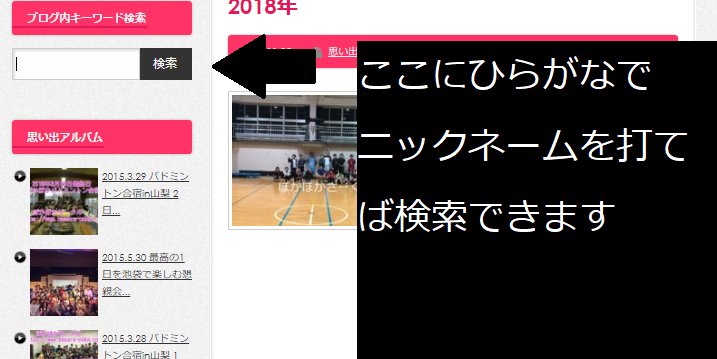 火バド以外は思い出アルバムのブログ検索画面にて、ひらがなで名前を打つと参加回数を確認できます。